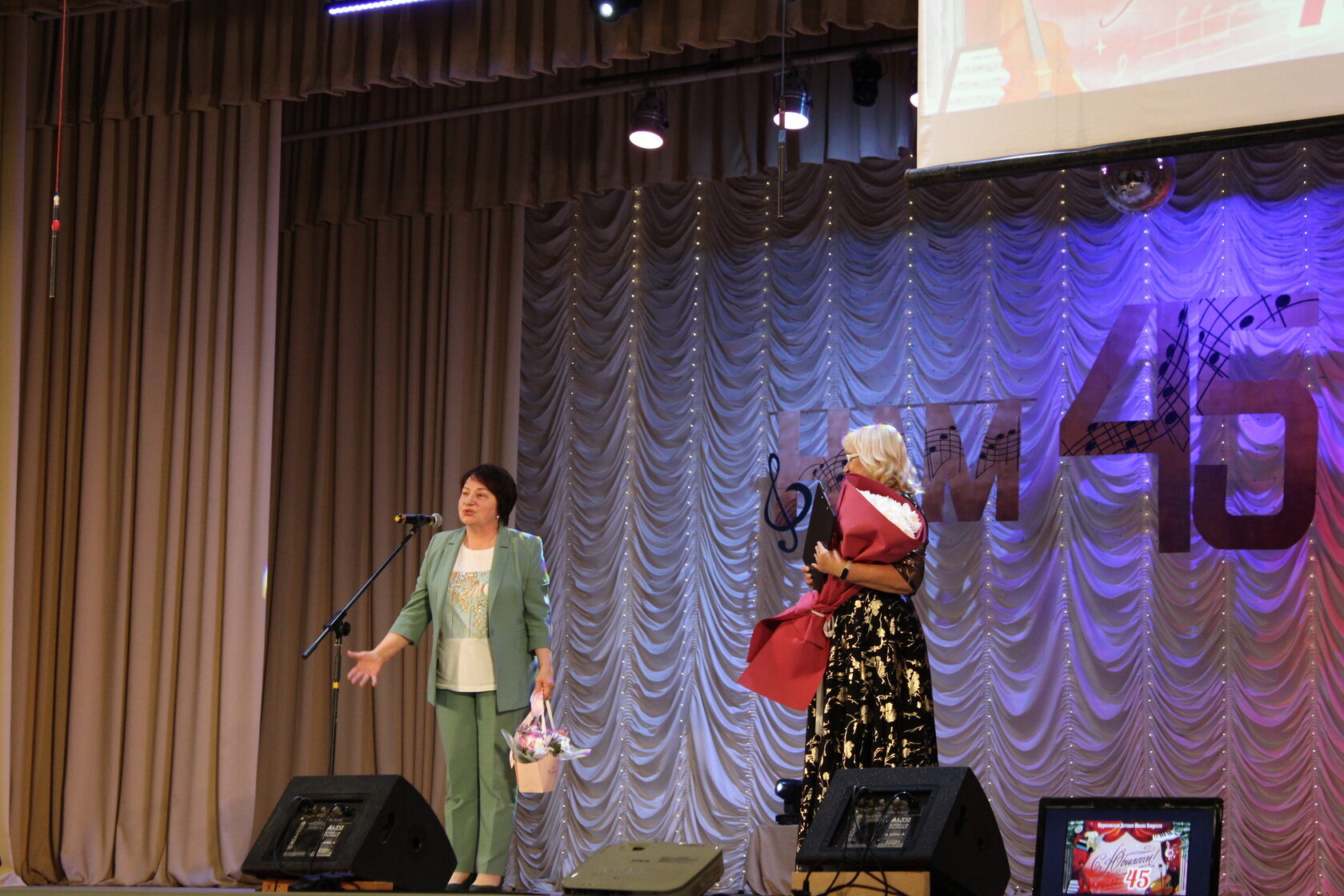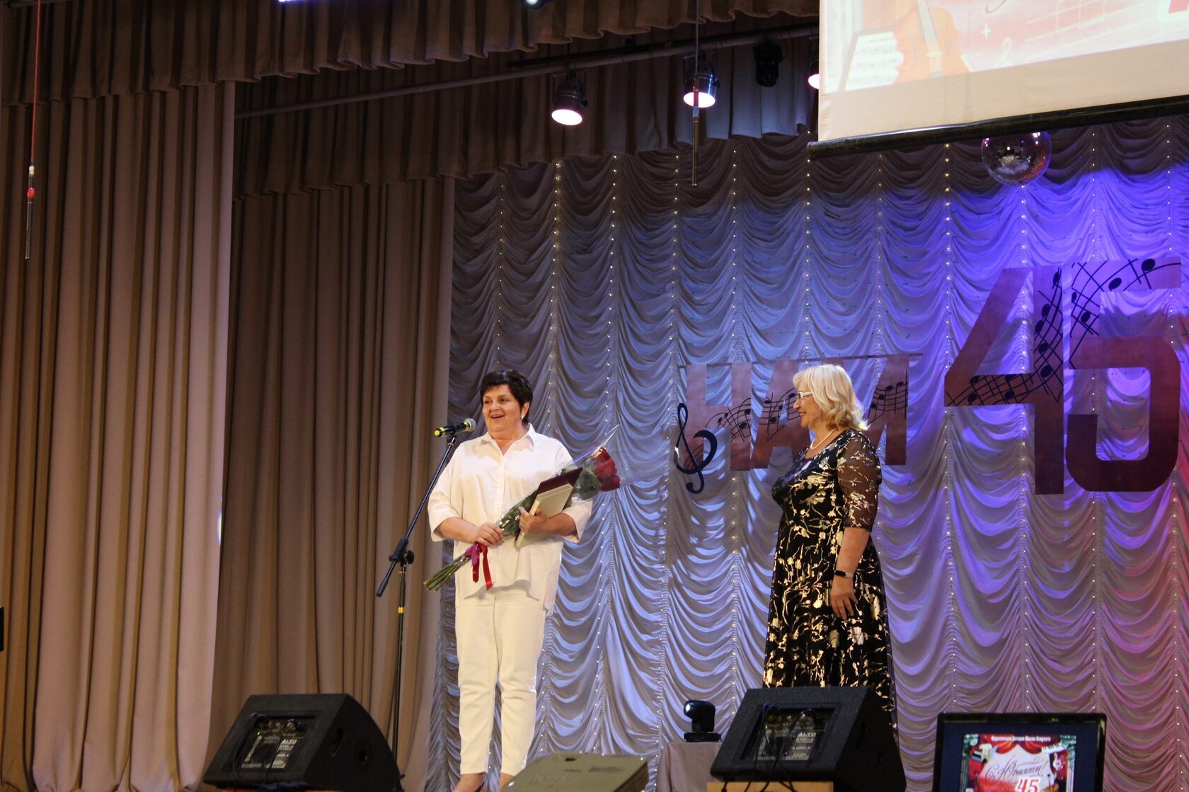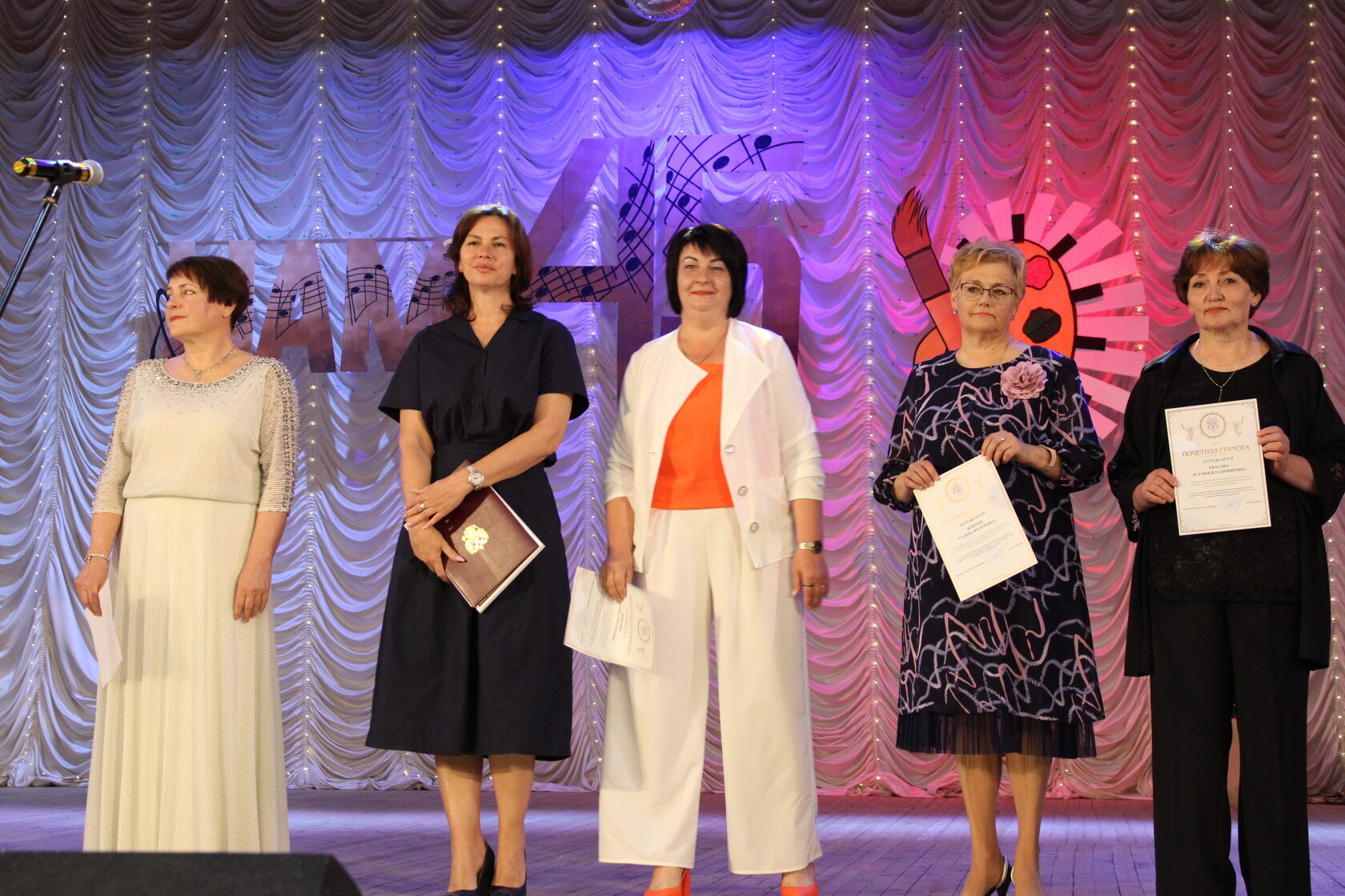 С теплыми поздравлениями и цветами на сцену поднимались представители Госсовета РК, администрации Сакского района, общественных организаций и Крымского ресурсного методического центра художественного образования. Руководитель КРМЦХО Анжелика Белозерова зачитала поздравительный адрес от министра культуры РК Татьяны Манежиной, затем вручила преподавателям школы почетные грамоты от Министерства культуры за высокий профессионализм и добросовестный труд.